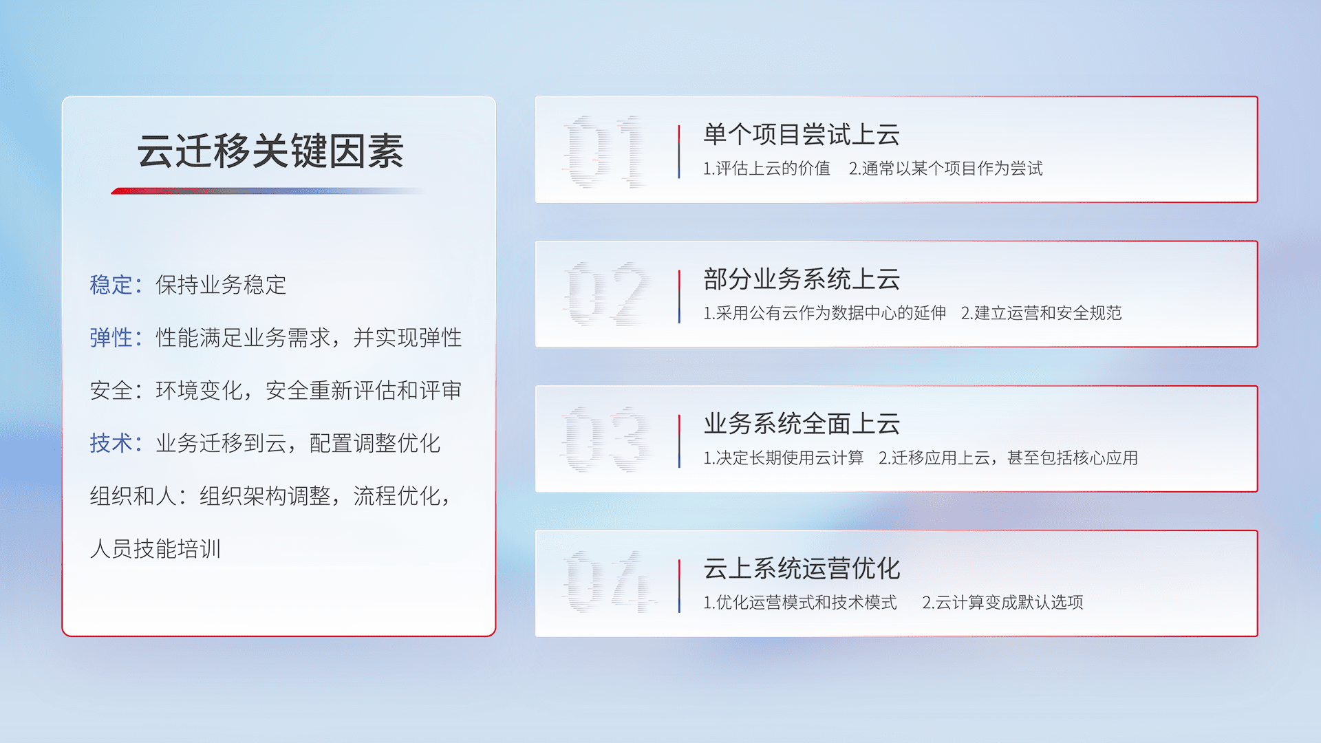 结合实际业务,,,,从规划设计、、云平台选型、、、、云原生改造、、、、数据迁移、、、、集成交付,,,迁移全过程为客户识别最佳上云路径,,做好风险识别管理,,,设计网络架构、、、身份权限、、、安全审计合规、、、、操作审计、、、、日志审计、、、、监控告警策略、、、、多站点容灾设计等,,对云上基础设施进行整体规划,,提升IT治理水平,,以满足弹性、、、、高可用、、、、高性能的需求。。。