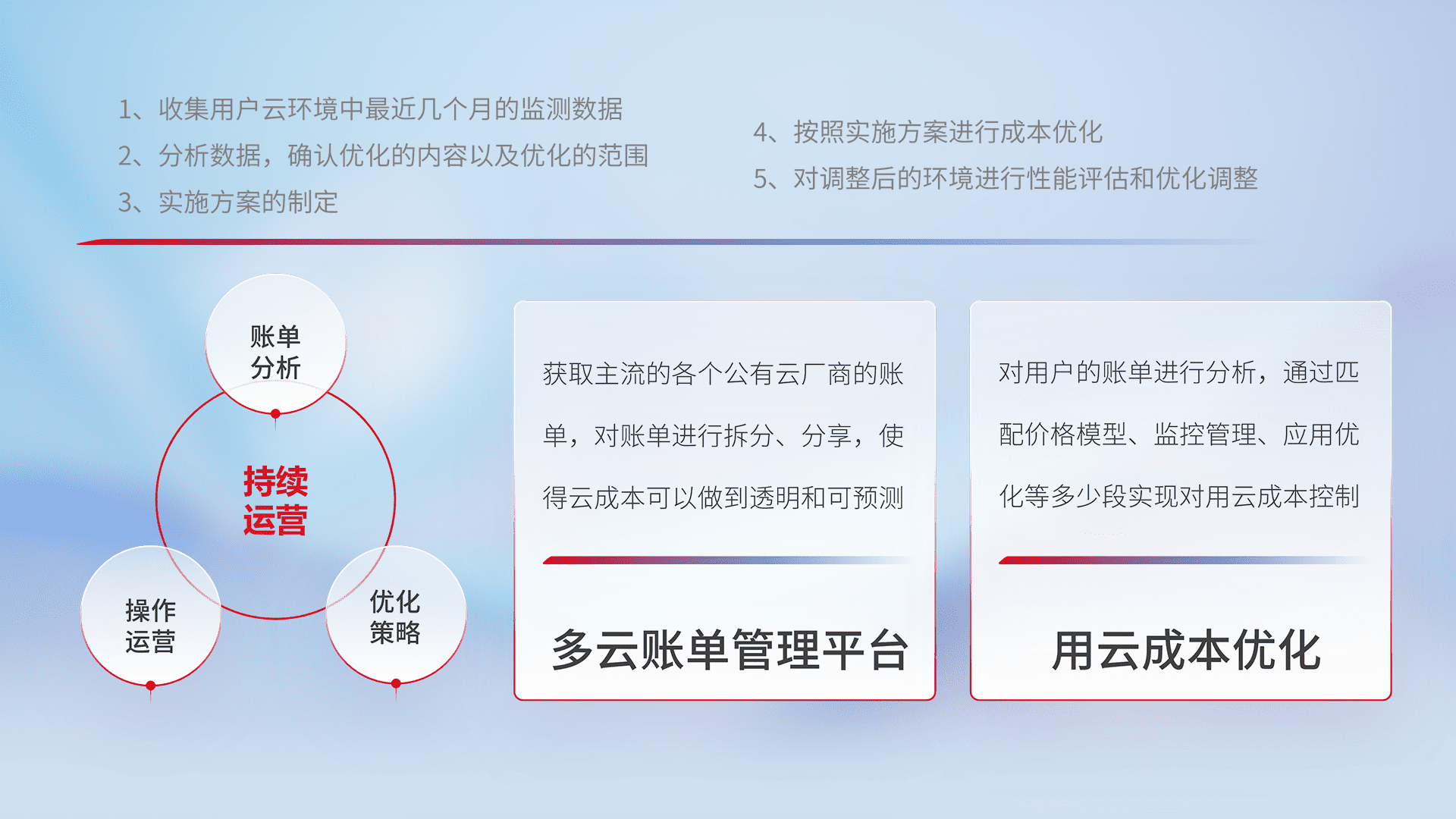通过多云纳管,,,以统一的资源数据模型把客户的云资源进行抽象和封装,,,,进而实现对多云资源的统一操作,,,,保障云资源管理的可靠性、、、、稳定性与可用性。。量身定制化运维内容,,,,配置、、开发运维、、、补丁管理、、备份、、监控、、认证和访问管理、、审计和日常巡检等,,保障在用云过程中的可靠度,,稳定度以及高可用率。。